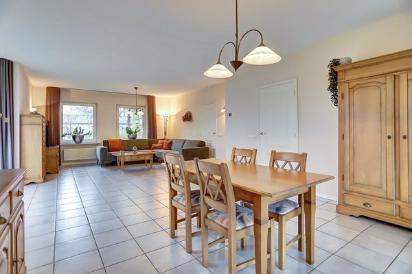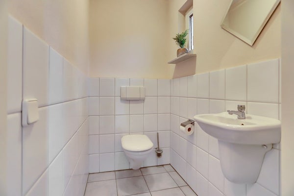 Op de begane grond vind je daarnaast een ruim, rolstoelvriendelijk toilet: praktisch, toekomstgericht en comfortabel. De badkamer met ligbad, toilet en wastafel is uitgevoerd in lichte, neutrale tegels en heeft een draaikiepraam voor frisse lucht. Een fijne plek om te ontspannen na een lange dag of de ochtend fris te beginnen.
