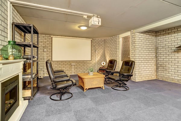 Beneden aangekomen voelt het meteen knus en beschut, nooit koud, nooit benauwend maar juist prettig constant van temperatuur. De grootste ruimte is ingericht als een sfeervolle bioscoop en extra woonkamer of fijne chillplek. Filmavond met het hele gezin, gamen met vrienden, een rustige loungehoek... het kan hier allemaal. En extra bijzonder: via een stalen luik in de tuin kun je deze ruimte ook rechtstreeks van buiten bereiken. Ideaal voor pubers, logés of hobby’s waarbij je niet steeds door het hele huis wilt lopen.