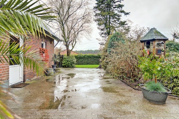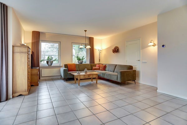 Je rijdt de ruime oprit op en voelt meteen: hier is plek. Plaats voor auto’s, gasten, spelen, thuiskomen. Via het paadje wandel je door de fraai aangelegde voortuin, die met twee statige dennenbomen en volwassen beplanting een verzorgde uitstraling biedt, richting de dubbele voordeur. Een entree die meteen iets belooft.