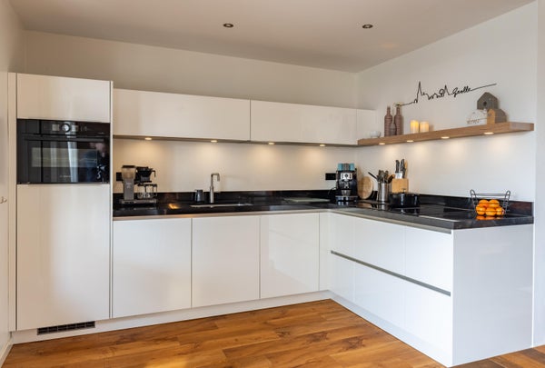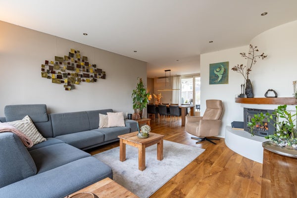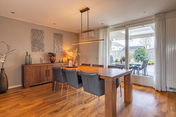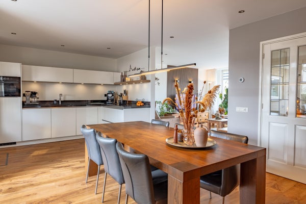 Aan het einde van de dag slinger je rustig door de wijk en parkeer je gemakkelijk op de ruime oprit. De voordeur tref je bij deze woning aan de zijkant en in de hal bekijken we eerst rechts het toilet met fontein en een handige vaste kast. De trap omhoog pakken we straks, eerst door naar de riante woonkeuken. Hier nemen we plaats aan de keukentafel en onder het genot van een kop koffie horen we hoe fijn het wonen was op dit plekje. Maar ook alle aanpassingen en verbouwingen die door de jaren zijn gedaan passeren de revue. Zo is de keuken in 2021 nog compleet vernieuwd waarbij aan alle apparatuur is gedacht. We noteren een inductiekookplaat met geïntegreerde afzuigkap, Quooker, combi-stoomoven en natuurlijk een koelkast en vaatwasser. Dit alles afgewerkt met een fraai granieten werkblad. De airconditioning is er hier vanaf 2023 bij gekomen en nu al niet meer weg te denken. Een groot gedeelte van het jaar staat hier de schuifpui open om de zon binnen te laten.