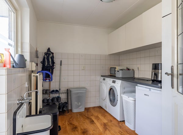 Voor heb je fraai zicht op de imposante bomenpartij waar net een eekhoorn van de ene naar de andere tak springt! We bekijken hier ook met een glimlach de kunststof kozijnen en het vakkundig gestucte plafond met spotjes die de kamer en de keuken in een ander daglicht zetten. De aanbouw achter de keuken is ook door de jaren heen gerealiseerd en niet meer weg te denken. Een fijne verwarmde ruimte waar je gemakkelijk al je witgoed kwijt kan. De extra spoelbak komt altijd goed van pas, net als de tuindeur met hor. En die tuin lonkt maar we gaan eerst de verdiepingen verkennen.