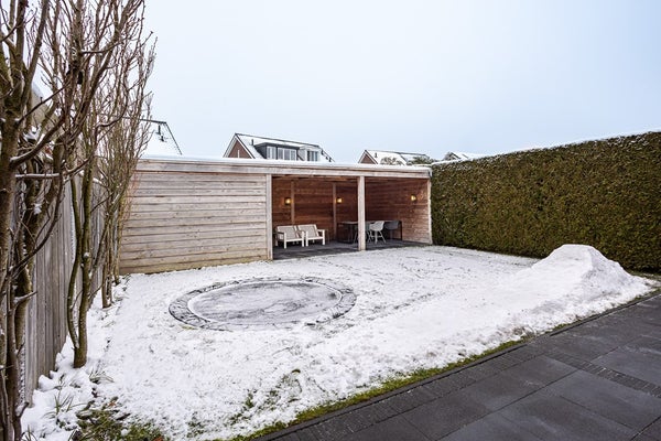 Zonnige ruime achtertuin (zuiden) met houten overkapping en berging.