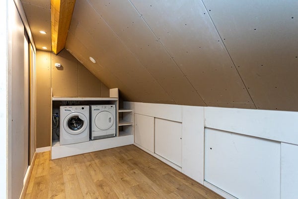 overloop, 2 slaap-/werkkamers, bergruimte met kastenwand en witgoed-aansluitingen.