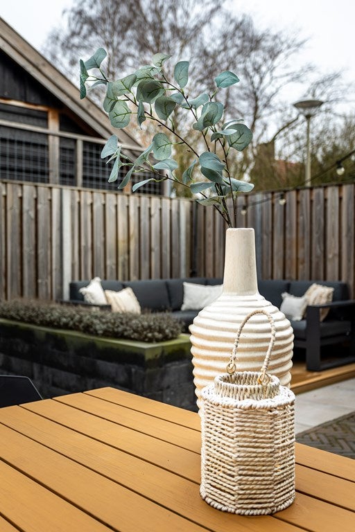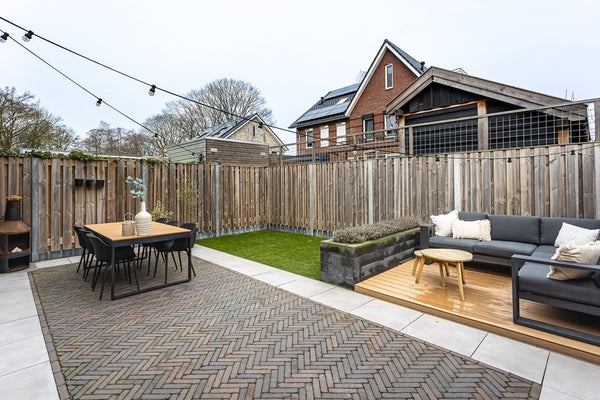 Onderhoudsvriendelijke achtertuin, gelegen op het noorden, met houten tuinberging en achterom.