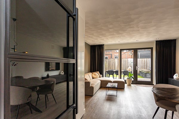 hal/entree, luxe (hang)toilet met fontein, L-vorm eet-/woonkamer met bergkast, vloerverwarming en PVC-vloer, toegang tot terras en tuin middels openslaande deuren, luxe moderne halfopen keuken in dubbele opstelling met diverse inbouwapparatuur.