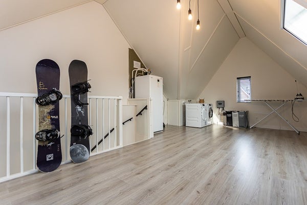 middels vaste trap te bereiken open zolder met laminaatvloer, dak- en gevelramen, witgoedaansluitingen, achter de knieschotten bergruimten.