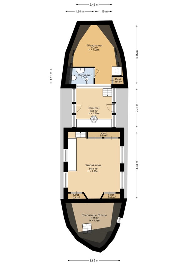 - Lengte x breedte x diepgang = 14,99 x 4,70 x 1,25