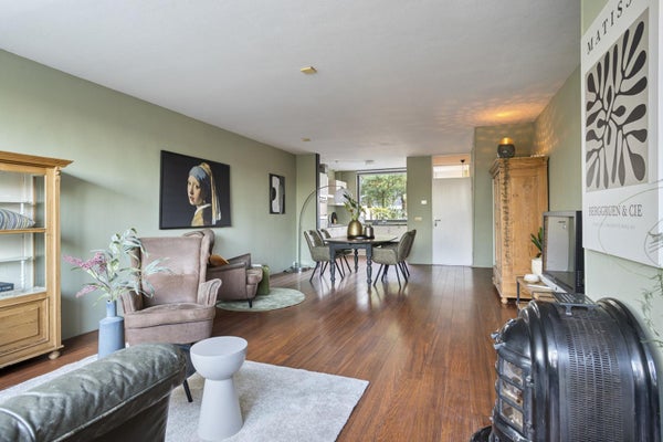 Bij binnenkomst tref je een prettige hal met toilet en toegang tot de woonkamer. De ruime woonkamer is uitgebouwd en biedt een fijne leefruimte met veel licht en volop mogelijkheden voor een gezellige zithoek en eethoek.