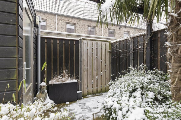 Voortuin met parkeerplaats (eigen terrein) en een zonnige achtertuin op het zuidwesten met houten berging en achterom middels een brandgang.