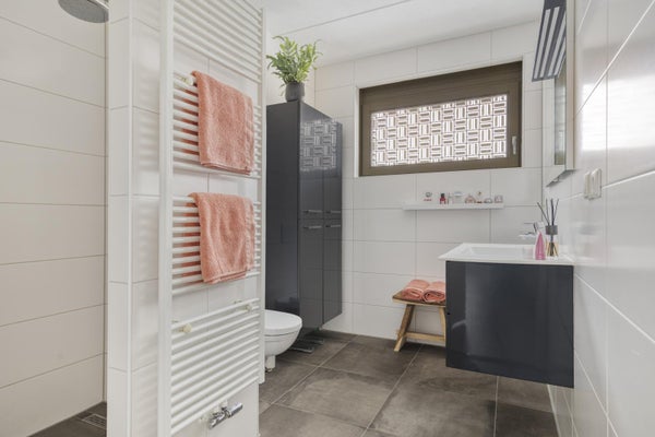 Eerste verdieping: overloop. Drie slaapkamers van ca. 15, 12 en 10 m2. Nette badkamer met wastafel, tweede toilet en douche.
