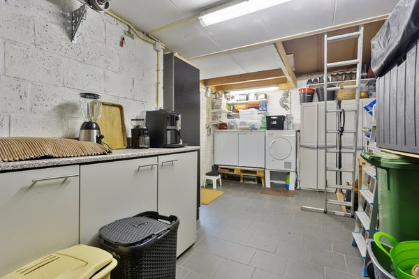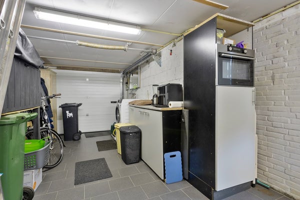 De ruime garage (ca. 20,5 m²) is bereikbaar via een rolpoort en een loopdeur vanuit de tuin. De garage is voorzien van elektra, water en witgoedaansluitingen en biedt volop ruimte voor het parkeren van een auto, het stallen van fietsen of voor extra opslag. Daarnaast beschikt de garage over een praktische vliering met een vloeroppervlakte van circa 17 m², ideaal als aanvullende bergruimte.