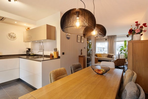 Een elegante glazen deur leidt naar de ruime woonkamer met open keuken (totaal ca. 35,5 m²), het kloppend hart van de woning. De tegelvloer loopt naadloos door vanuit de hal en versterkt het ruimtelijke karakter. Dankzij de grote raampartijen en openslaande deuren geniet u hier van veel daglicht en een mooi zicht op de tuin. De openslaande deuren geven direct toegang tot het terras.