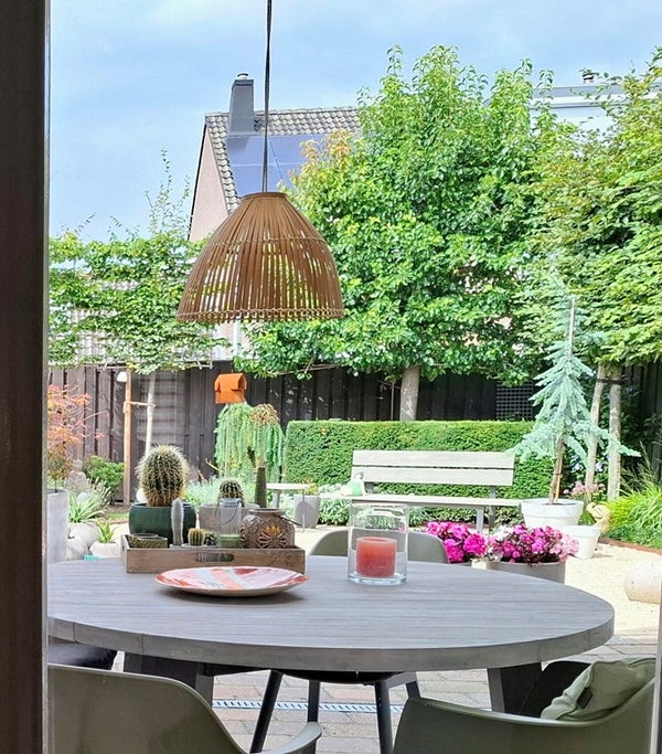 De fraai aangelegde , grotere en sfeervolle achtertuin is bereikbaar vanuit de woonkamer, keuken en garage. De tuin is volledig omsloten en biedt veel privacy dankzij onder andere de aanwezige leibomen. Direct grenzend aan de leefruimte bevindt zich een overdekt terras met lichtstraat, waar u beschut en comfortabel kunt genieten van het buitenleven. De onderhoudsvriendelijke inrichting maakt deze tuin zowel praktisch als sfeervol.