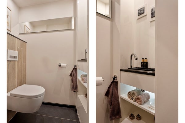 Via de verzorgde entree (ca. 5 m²), voorzien van een stijlvolle donkere tegelvloer, betreedt u de woning. Vanuit de hal heeft u toegang tot de meterkast, de toiletruimte en de woonkamer met open keuken. Het toilet is modern afgewerkt en voorzien van een Sphinx/Geberit hangcloset en een fonteintje. De gehele begane grond is uitgerust met comfortabele vloerverwarming.