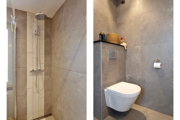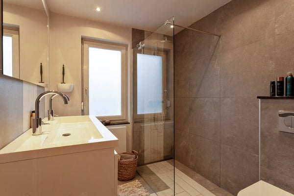 • Badkamer: Deze moderne, betegelde badkamer is ca. 4,5 m² groot en uitgerust met een inloopdouche met regendouche, een wastafelmeubel met dubbele wasbak en een modern hangcloset. Bovendien is de badkamer voorzien van een comfortabele vloerverwarming.