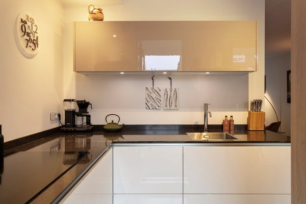 De hoogwaardige, moderne keuken is opgesteld in een praktische L-vorm en gesitueerd aan de achterzijde van de leefruimte. Deze is voorzien van diverse Siemens inbouwapparatuur, waaronder een inductiekookplaat, afzuiging, koelkast, vaatwasser en combi-oven. Het ruime hardstenenwerkblad, de diepe laden en de efficiënte indeling maken de keuken zowel stijlvol als functioneel. Vanuit de keuken heeft u eveneens toegang tot de tuin.