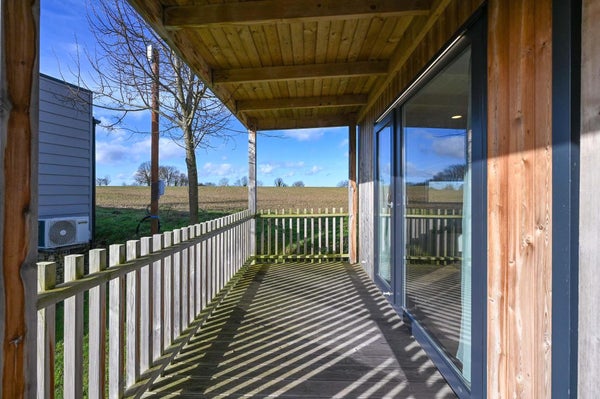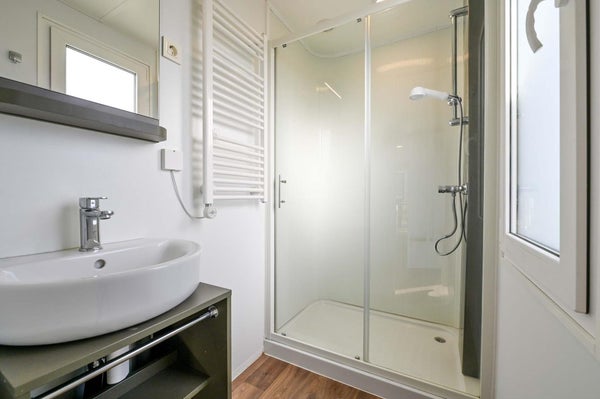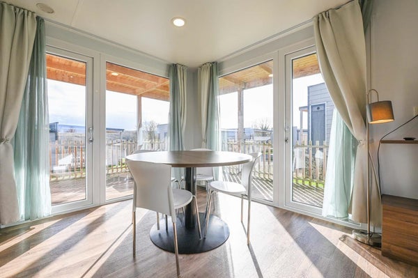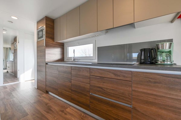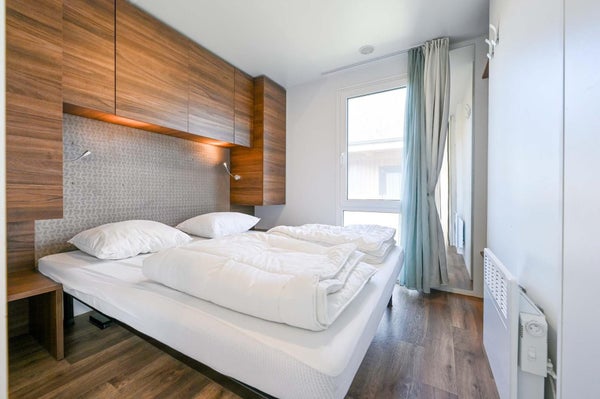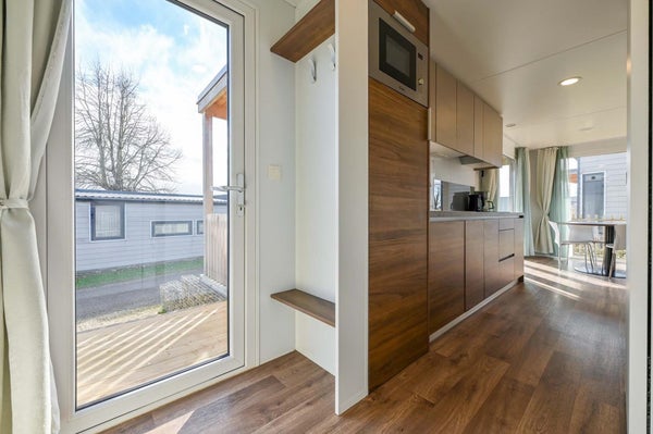 Het chalet is compleet ingericht en voorzien van vloerverwarming en airconditioning. De woonkamer biedt toegang tot de veranda op het zuiden met loungeset en picknicktafel. De open keuken is o.a. uitgerust met een inductie kookplaat, koel-vriescombinatie, combimagnetron en vaatwasser. Er is een ouderslaapkamer met een tweepersoonsbed met kastombouw en extra kastruimte en een tweede slaapkamer met twee eenpersoonsbedden en bovenkastjes. In de badkamer vind je een douche en wastafel en het toilet is separaat. Er is eigen parkeergelegenheid.