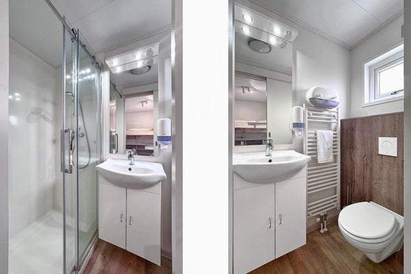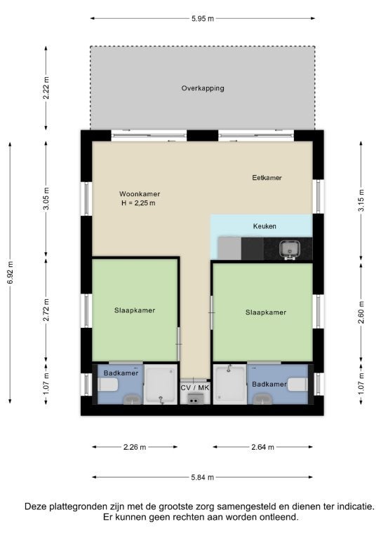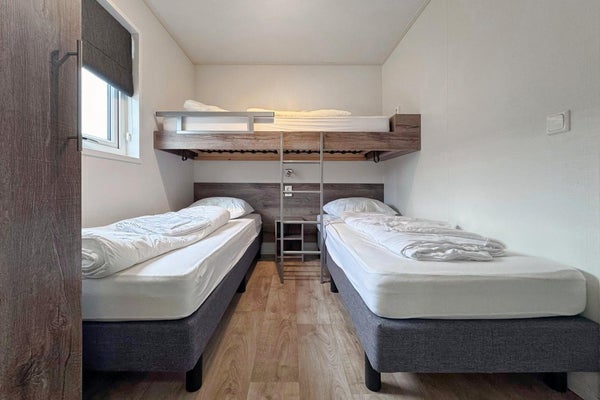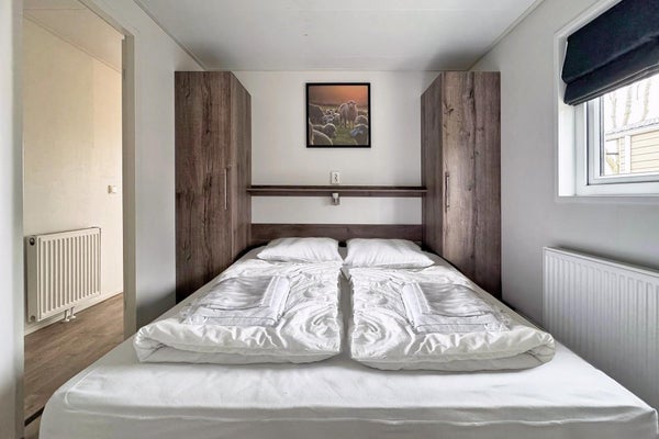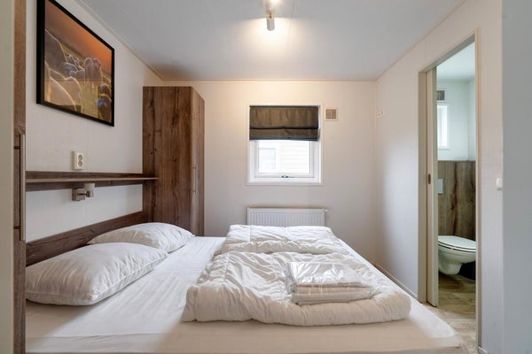 Bij binnenkomst in deze bungalow tref je een gezellige woonkamer van ongeveer 5,95 m breed en 3,05 m diep aan. De open keuken is praktisch ingericht. Er zijn twee slaapkamers, elk met een eigen badkamer; de hoofdslaapkamer meet 2,26 m bij 2,72 m en de tweede slaapkamer is 2,64 m bij 2,60 m.