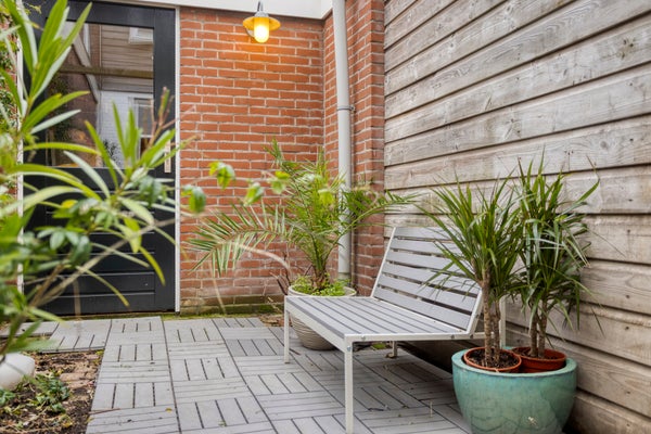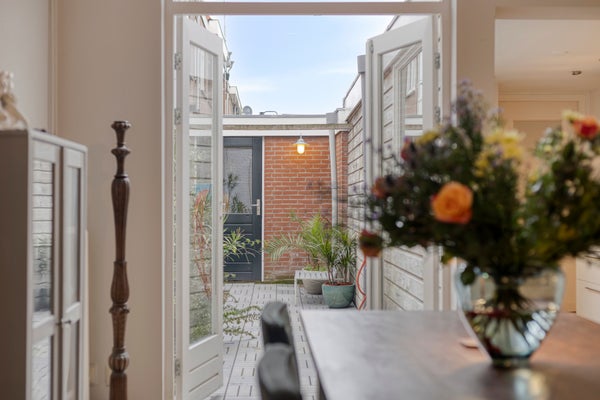 De woonkamer is prettig licht en heeft een fijne, warme sfeer. Grote raampartijen zorgen voor een aangename lichtinval en via de openslaande deuren loop je zo de knusse en beschutte stadstuin in: een heerlijke plek om buiten te zitten. Als extra buitenruimte is er bovendien de mogelijkheid tot een fijn dakterras op het platte dak.
