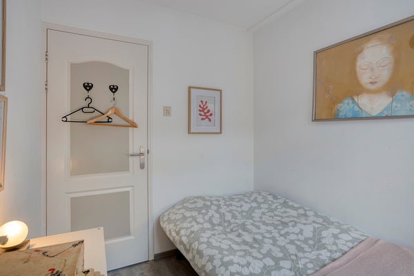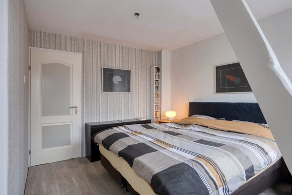 Overloop. 2 slaapkamers aan de voorzijde. Toilet met fontein. Royale slaapkamer aan de achterzijde, met inbouwkast en CV-opstelling (uit 2023).