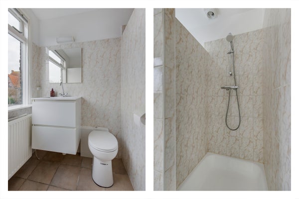 The first floor offers three well-proportioned bedrooms. The front bedroom provides access to a small balcony on top of the bay window, while the rear bedroom opens onto a generous south-facing balcony. The bathroom is fitted with a shower, washbasin and toilet. Thanks to dormer windows at both the front and rear, the second floor offers two additional large bedrooms. The washing machine and dryer connections are located in a separate laundry room—very practical. There is also ample storage space behind the knee walls and in the floored attic, which is accessible via a pull-down ladder from the landing.