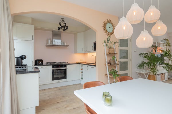 Bij binnenkomst valt direct de fijne lichtinval op. De ruime woonkamer is sfeervol ingericht en voorzien van een open haard, wat zorgt voor extra warmte en gezelligheid. De schuifpui naar de achtertuin laat binnen en buiten moeiteloos in elkaar overlopen en creëert een open, luchtige sfeer. De open keuken sluit hier naadloos op aan, is netjes afgewerkt en praktisch ingericht. Ook vanuit de keuken is de tuin bereikbaar, wat het geheel bijzonder gebruiksvriendelijk maakt.