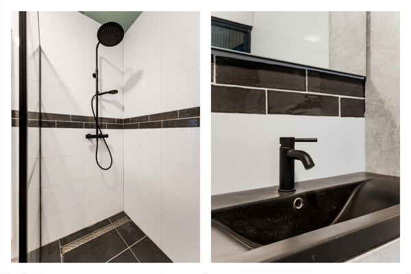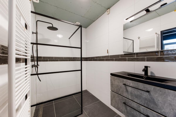 Vanuit de keuken is er toegang tot de gemoderniseerde badkamer met inloopdouche, wastafelmeubel en designradiator.