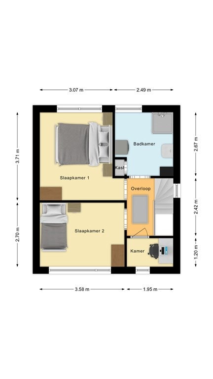 • De 2-onder-1-kapwoning heeft een woonoppervlakte van 73 m² en beschikt over 3 kamers, waarvan 2 slaapkamers;