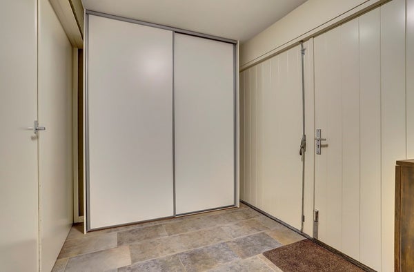 Vanuit de carport middels de dubbele deur kom je in het achterportaal uit met toegang tot de keuken en berging. Het achterportaal is voorzien van vloerverwarming en een grote inbouwkast wat ideaal is voor opslag van schoenen en jassen. Het verlengde van het achterportaal is de voormalige garage die tot het woonoppervlakte is bijgetrokken. De ruimte is netjes voorzien van een tegelvloer, beschikt over een radiator en kan multifunctioneel worden ingedeeld. De huidige bewoners gebruiken dit als extra opslag en als wasruimte.