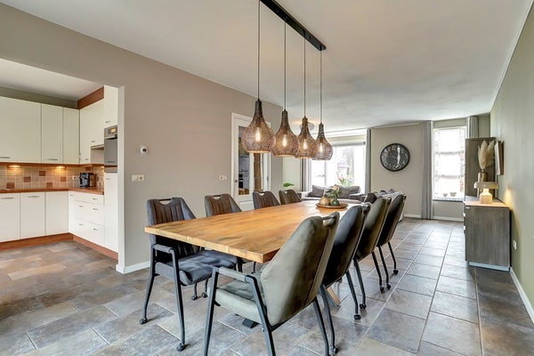 Wat een heerlijke royale ruimte om in te verblijven! Door de vele raampartijen en grote erker aan de voorzijde de woning en openslaande tuindeuren aan de achterzijde komt het daglicht van alle kanten binnen en krijg je een fraai uitzicht over de achtertuin. De gehele ruimte is op prachtige wijze afgewerkt met een natuursteen tegelvloer met vloerverwarming, stucwerk wanden en strakke plafonds. De voorzijde van de woning wordt momenteel in gebruik genomen als TV hoek en geeft vanuit de erker een vrij uitzicht. Aan de achterzijde tref je de eethoek wat fijne plek met toegang tot de keuken om met het gezin samen te komen. De ruimte is biedt genoeg plek voor een 8-persoons eettafel. Via openslaande (tuin)deuren stap je zo de serre in die ervoor zorgt dat de woonkamer nog extra verlengd kan worden.