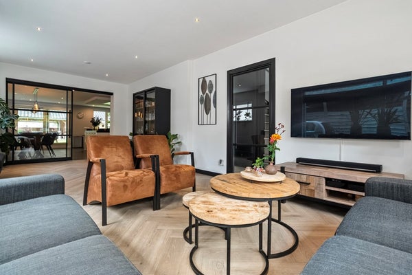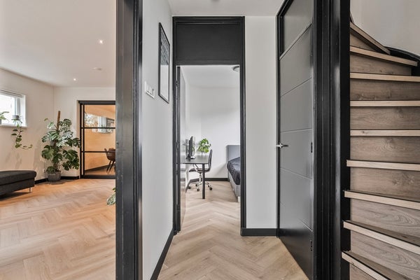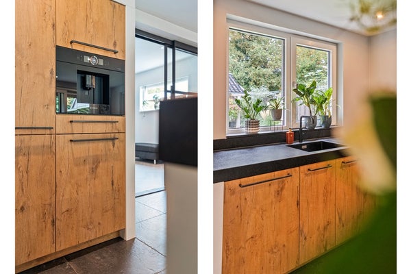 Tussen woonkamer en keuken vind je fraaie industriële kamer-en-suite deuren. Die geven niet alleen een stoere look, maar zorgen ook nog eens voor een flexibele indeling. Sluit je ze? Dan heb je rust aan beide kanten. Laat je ze openstaan, dan vloeit alles mooi in elkaar over.