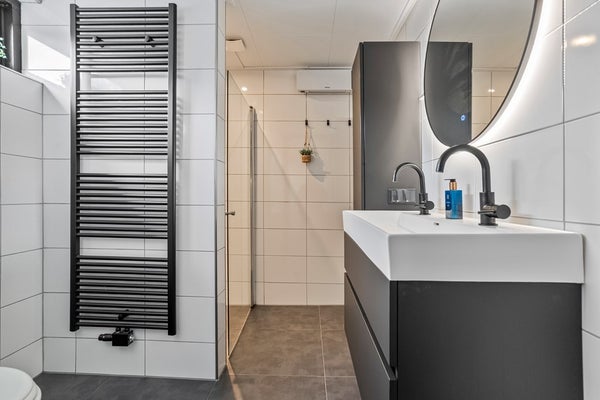 Overloop, drie slaapkamers en badkamer v.v. toilet, wandmeubel, inloopdouche, designradiator en dubbele wastafelmeubel.