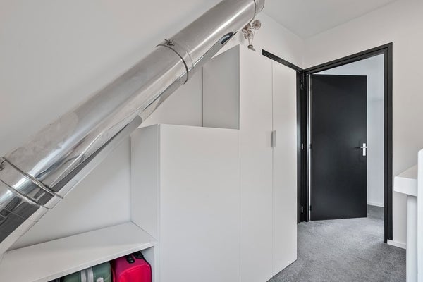 In de aangebouwde garage is slim nagedacht over comfort: hier vind je een extra separaat toilet en de omvormer van de zonnepanelen, zodat je die apparaten netjes uit het zicht hebt. Er is bovendien meer dan genoeg bergruimte voor fietsen, gereedschap of sportspullen.