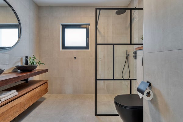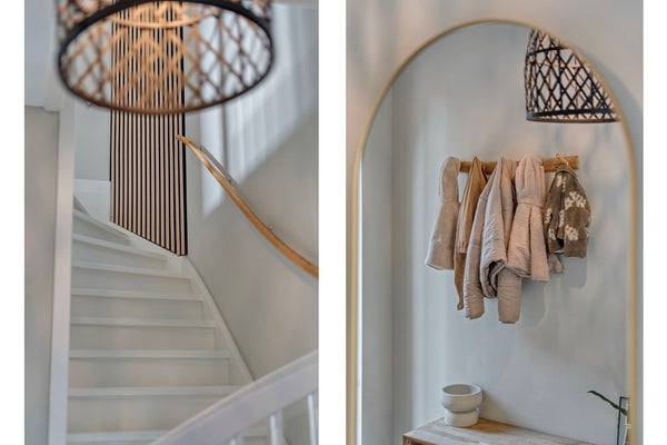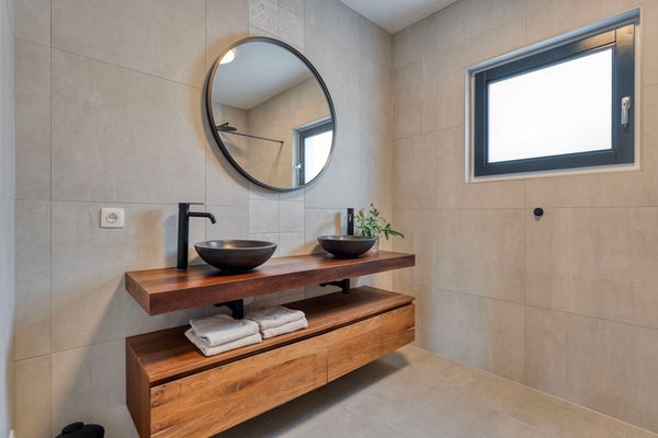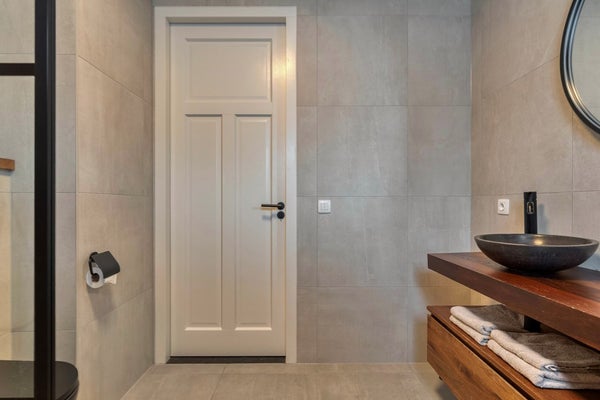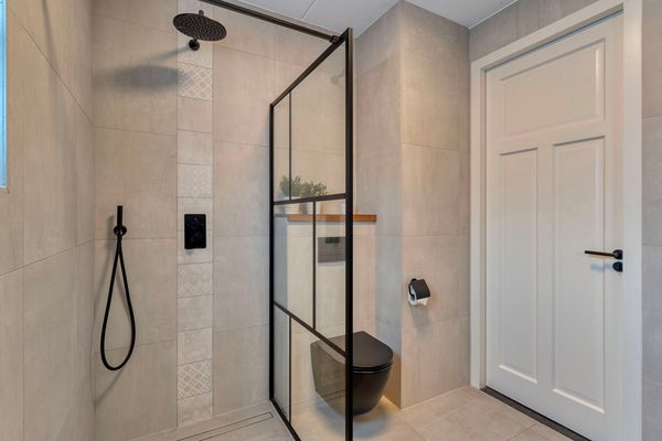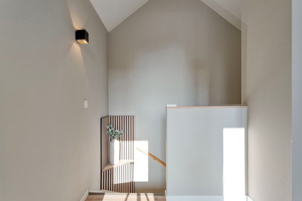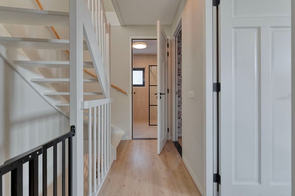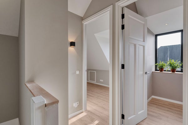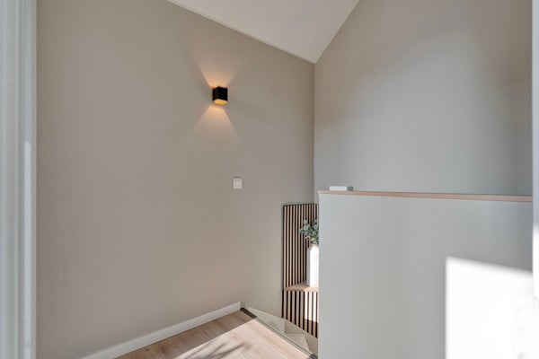 Overloop naar 3 ruime slaapkamers en een badkamer voorzien van dubbele wastafelmeubel, inloopdouche en hangend toilet. De eerste verdieping is volledig voorzien van vloerverwarming.
