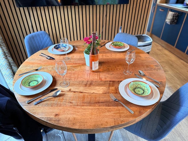 De eethoek vormt het gezellige middelpunt van de woning, een plek waar samen eten vanzelfsprekend wordt en waar u de dag rustig begint met koffie of juist afsluit met een lange maaltijd. Door de open indeling blijft het contact tussen keuken en woonkamer mooi behouden, wat zorgt voor een ontspannen, sociale sfeer.