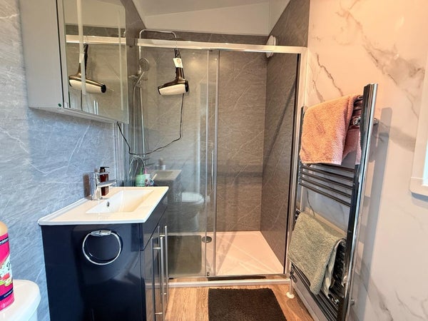 De badkamer is fris en netjes afgewerkt en sluit naadloos aan bij de moderne uitstraling van het geheel. Een prettige ruimte waar u de dag rustig begint of na een dag buiten juist ontspannen afsluit.