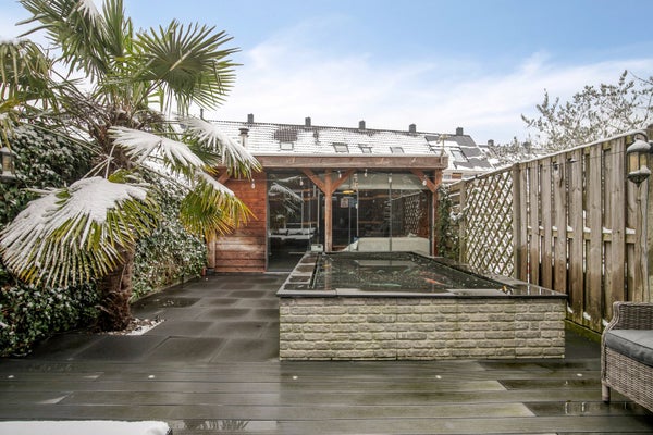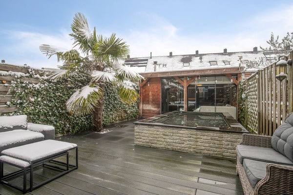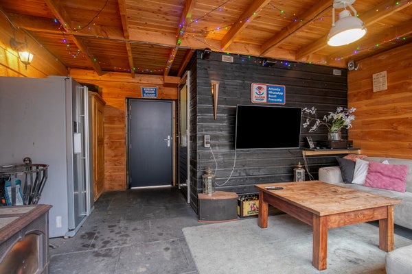 De onderhoudsvriendelijke tuin met een sfeervolle vijver op het noordoosten is een heerlijke plek om te ontspannen. Er is een houten overkapping met fietsenhok aanwezig. De overkapping is voorzien van een houtkachel en tv-aansluiting, ideaal voor gezellige avonden.