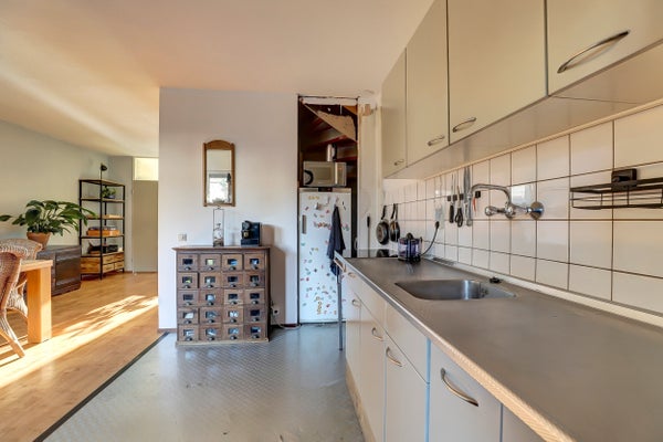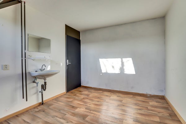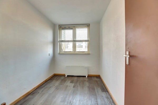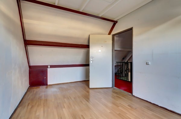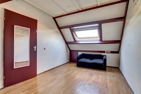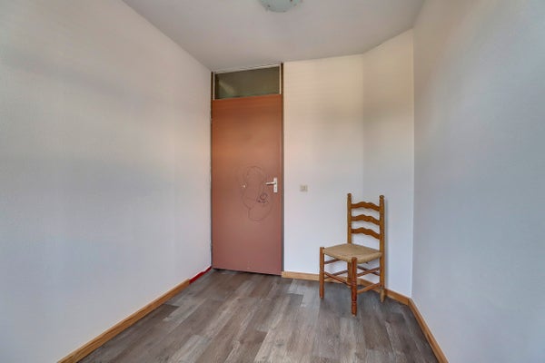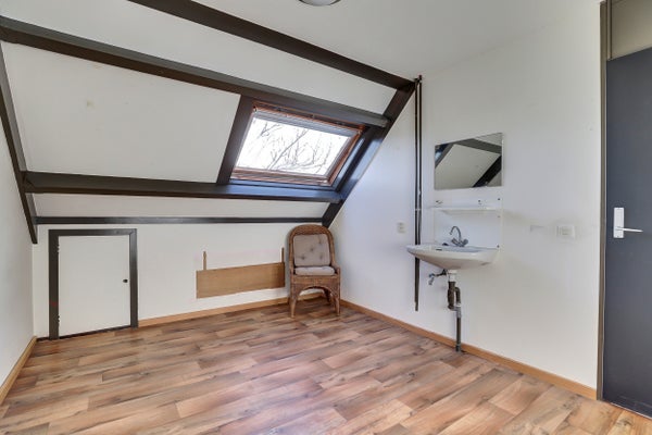 De indeling omvat een entree met hal, een lichte woonkamer met pvc vloer en een open keuken met eenvoudig keukenblok en bergruimte onder de trap. Op de eerste verdieping zijn drie slaapkamers, waarvan één met wastafel, en een badkamer met douche, wastafel en toilet. De zolderverdieping biedt een vierde slaapkamer en ruimte voor de CV-installatie.