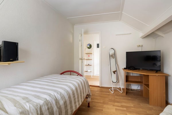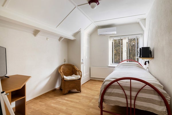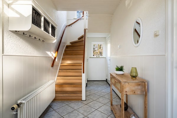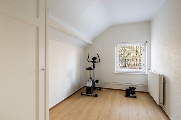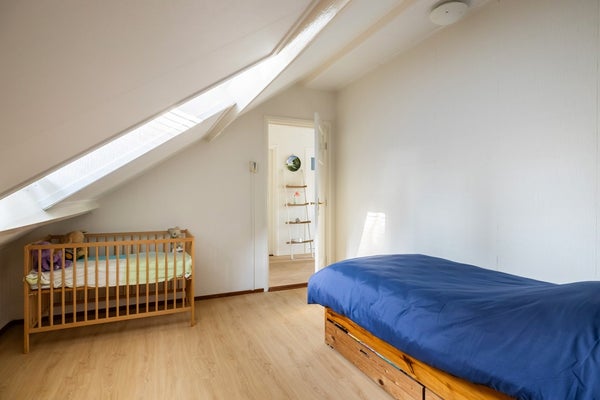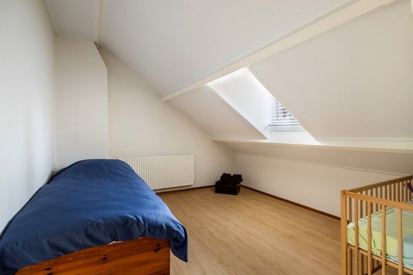 Via de vaste trap bereik je de overloop van de eerste verdieping. Vanaf hier heb je toegang tot drie slaapkamers en de badkamer. De badkamer is volledig betegeld en ingericht met een douche, toilet, wastafelmeubel en een praktische vaste kast. Zowel de badkamer als de aangrenzende slaapkamer, die eveneens over een vaste kast beschikt, bevinden zich aan de voorzijde van de woning. Aan de achterzijde liggen de overige twee slaapkamers. Eén van deze kamers is voorzien van een vaste kast, terwijl de andere dankzij de dakkapel extra licht en ruimte biedt. Op de overloop zelf is tot slot ook nog een vaste kast aanwezig, ideaal voor extra bergruimte.