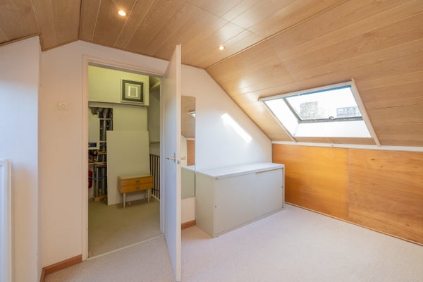 Overloop met CV ketel (2025), opbergruimte, ruime 4e slaapkamer met dakramen en knieschotten.