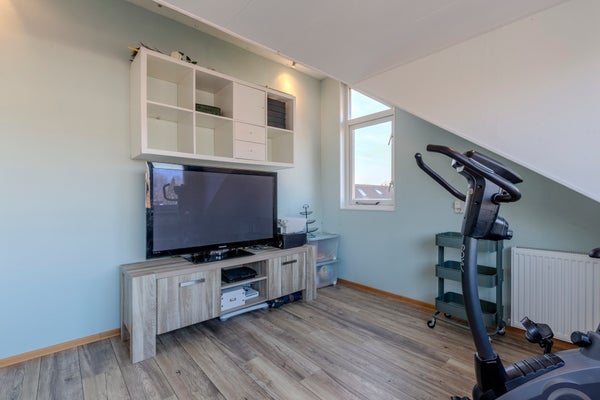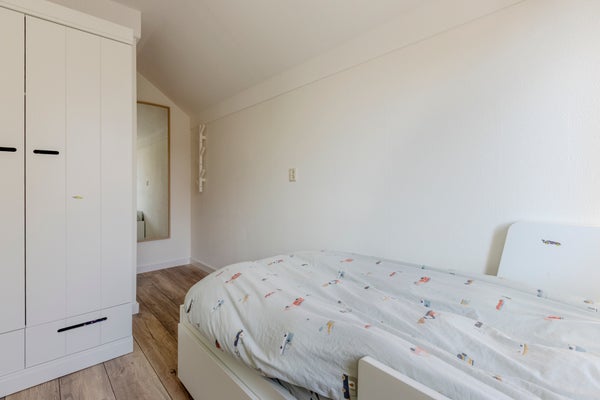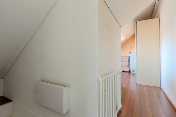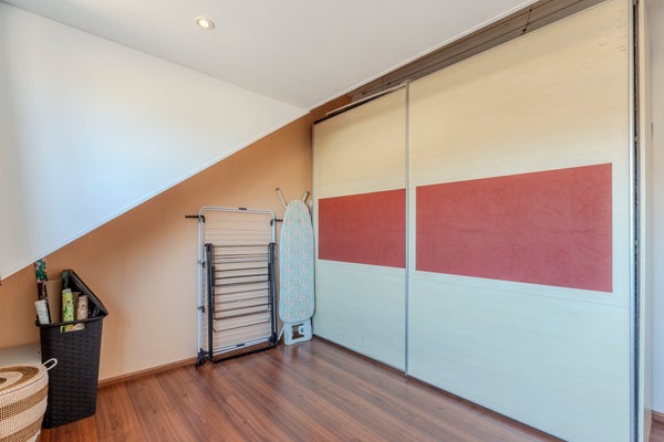 Op de overloop bevinden zich een bergkast en toegang tot de moderne badkamer, die is voorzien van een douche, wastafelmeubel, toilet en mechanische ventilatie. Aan de achterzijde van de woning ligt een royale slaapkamer over de volledige breedte van het huis, met een praktische trapkast. Aan de voorzijde bevinden zich twee slaapkamers, beide uitgerust met rolluiken.