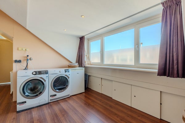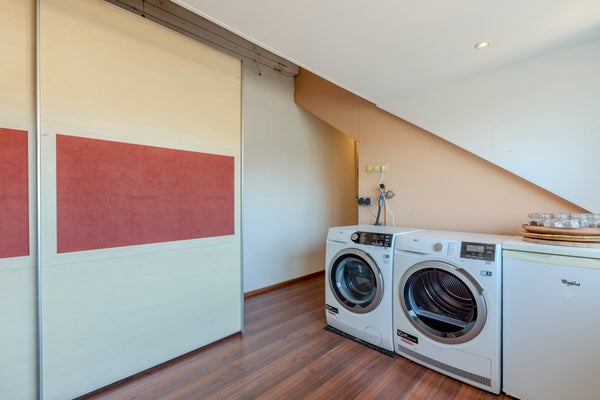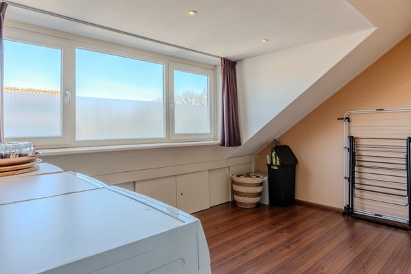De overloop geeft toegang tot de technische ruimte met het heteluchtverwarmingssysteem, de cv-ketel voor warm water en de mechanische ventilatie (MV-box). Daarnaast bevindt zich hier een royale, open ruimte met dakkapel en aansluitingen voor wasmachine en droger. De vierde, ruime slaapkamer is eveneens voorzien van een grote dakkapel.