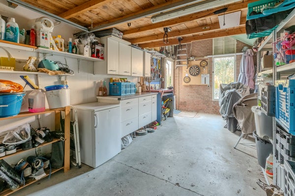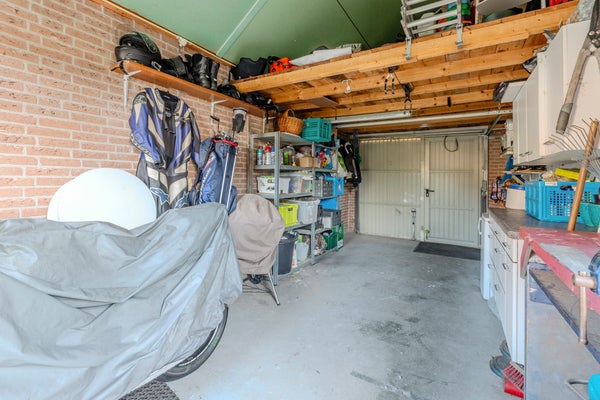 De fraai aangelegde voortuin en de oprit met parkeergelegenheid voor twee auto’s geven toegang tot de extra royale garage, voorzien van een ruime bergvliering. De garage is zowel via de oprit als vanuit de achtertuin bereikbaar en beschikt over water en elektra.