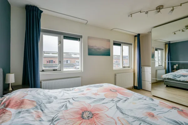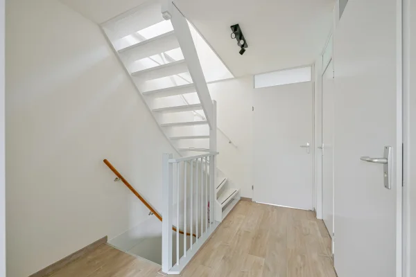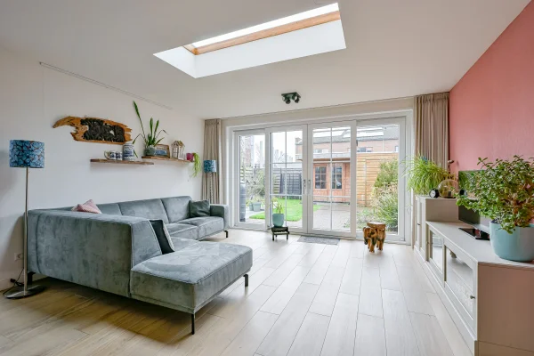 De benedenverdieping heeft een ruime woonkamer met open keuken en veel lichtinval door de grote raampartijen, met zicht op de diepe achtertuin. De tuin is mooi aangelegd en ligt op het zuidoosten. De eerste verdieping heeft drie slaapkamers en een recent vernieuwde badkamer. De tweede verdieping biedt nog een vierde slaapkamer met veel ramen.