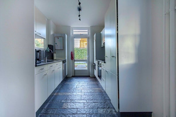 Aansluitend aan de woonkamer bevindt zich de open keuken, voorzien van diverse inbouwapparatuur, waaronder een bordenwarmer, oven, koelkast, vaatwasser, keramische kookplaat en afzuigkap. Vanuit de keuken is eveneens toegang tot de achtertuin en via een raampartij is er uitzicht over de aanbouw.
