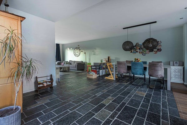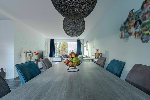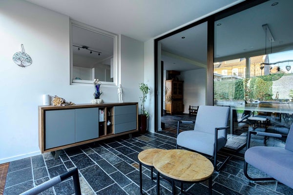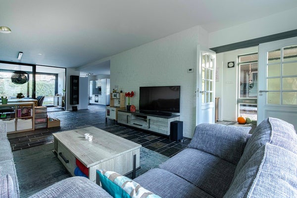 De ruime woonkamer kenmerkt zich door veel lichtinval dankzij de grote raampartijen aan zowel de voor- als achterzijde. In combinatie met de aanbouw ontstaat een fijne leefruimte van ca. 59 m². Via de aanbouw is de achtertuin bereikbaar middels een schuifpui.