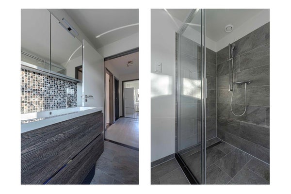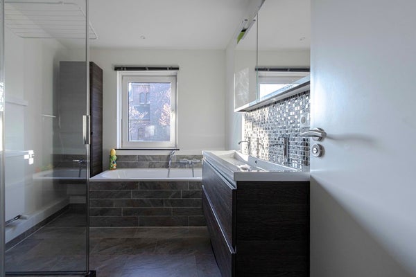 De moderne badkamer van ca. 7,2 m² is van alle gemakken voorzien. Hier kun je kiezen voor een snelle douche in de inloopdouche met glazen wand, of genieten van een ontspannen bad in het fraai afgewerkte ligbad. Daarnaast is de badkamer uitgerust met een dubbele wastafel en een groot raamkozijn, dat zorgt voor veel daglicht en natuurlijke ventilatie. Het aparte tweede toilet op deze verdieping is eveneens modern afgewerkt, volledig in dezelfde stijl als de badkamer, en voorzien van een fonteintje en raam voor licht en ventilatie.