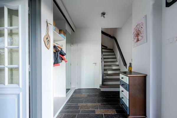 We betreden de woning via de zeer ruime entree, die direct een prettig gevoel van ruimte geeft. Hier bevindt zich een mooie vaste kast voor de garderobe. Vanuit de hal zijn het moderne, zwevende toilet met fonteintje en de woonkamer bereikbaar. Opvallend is de sfeervolle tegelvloer, die grotendeels over de begane grond is doorgelegd.