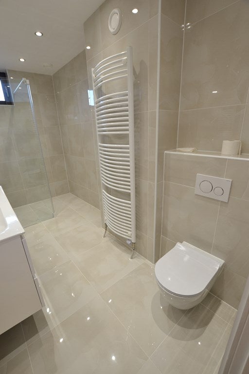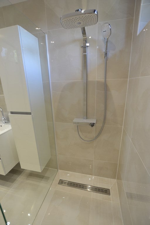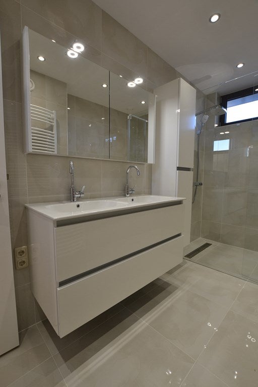 De tweede volledig vernieuwde badkamer 3,75 x 1,90 is voorzien van een moderne tegelvloer met vloerverwarming, inloopdouche, hangtoilet en badkamermeubel met wastafel met twee kranen.