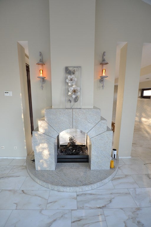 Twee hardglazen deuren bieden toegang tot de woonkamer 11,95 x 5,65/5,45 met marmeren vloer met vloerverwarming, muren van schoonmetselwerk, plafonds met inbouwspots, schouwpartij als roomdevider met doorkijk gashaard en veel lichtinval met ramen aan voor-, zij- en achtertuin.